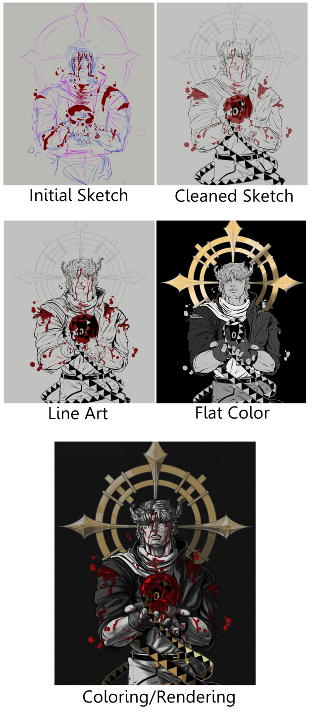 Artist will send a progress shot after each major point (e.g. preliminary sketch, cleaned up sketch, line art, flats, color/render) for feedback, but may send more than this.